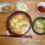 天津飯、はるさめサラダ、豆腐ときのこのお味噌汁、お漬物 天津飯には旬の竹の子やアスパラガスが入っていてとても美味しかったです。並の量を頂きました。はるさまサラダにはきゅうりや人参やコーンや玉葱が入っていておかわりをしました。