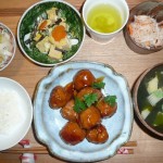 肉団子の甘酢、わらびと高野豆腐と人参の玉子とじ、大根と人参のなます、若竹汁、お漬物 久し振りの肉団子美味しかったです。旬のわらび初物でした。玉子とじは良く合って美味しいですね。これまおまた旬の若竹汁とても美味でした。