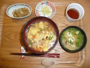 天津飯、はるさめサラダ、豆腐ときのこのお味噌汁、お漬物 天津飯には旬の竹の子やアスパラガスが入っていてとても美味しかったです。並の量を頂きました。はるさまサラダにはきゅうりや人参やコーンや玉葱が入っていておかわりをしました。