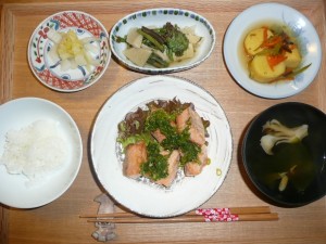 しゃけの香味焼き、さつまいもの煮物、わらびと竹の子の煮浸し、わかめと舞茸のお澄まし、白菜の漬物 旬のわらびと竹の子を堪能しました。しゃけもねぎの香味がよく効いておいしかったです。さつまいもも甘くてなんだか新鮮でした。