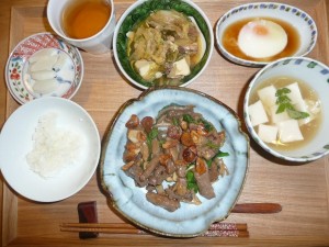 ガーリックとほうれん草ときのこと肉の炒め物、温泉玉子、胡麻豆腐と糸寒天、はんぺんとさば缶と白菜の煮物、大根のお漬物 今日の牛
