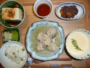 山芋いり肉団子のスープ、冷奴、胡麻豆腐入り茶碗蒸し、かぼちゃとあずきのいとこ煮、うりと白菜のお漬物、豆ごはん 肉団子には山芋や生姜が入って健康に良さそうでした。スープには椎茸が入っていました。いとこ煮も甘くて美味しいですね。久しぶりの茶碗蒸しでした。今日はやわらかいものが中心でご老人には良さそうでした。