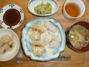 水餃子焼き餃子、大根ときゅうりの酢の物、にゅう麺、じめじご飯 好きな餃子は焼きも水も両方頂きました。この頃食欲が出てきたので美味しかったです。しめじご飯は少々固めでした。にゅう麺も美味しかったですね。
