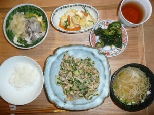 豚肉とにらと玉葱の甘味噌炒め、酢じめのあじと玉葱、高野豆腐と揚げと人参の玉子とじ、にゅう麺、きゅうりの漬物 にゅう麺は旬の茗荷が入っていて美味しくておかわりしてしまいました。にゅう麺は暑くても熱いのが美味しいですね。酢じめのあじはまたこれ美味しかったですよ。酢の物はこの時期さっぱりしていいですね。豚肉の炒め物もにらが良かったです。デザートにつぶあんの寒天がでました。美味でした。