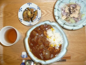 コーンライスのハヤシライス、豆腐ときゅうりと紫玉葱と紫蘇のサラダ、なすの漬物 ハヤシライスの中にはおからが入っているらしいです。コーンのライスとよく合いとても美味しかったのでおかわりしました。サラダも紫蘇味が良く効いていて爽やかでした。今日から7月ですね。一年半分終わりました。また暑い夏が来ますね。