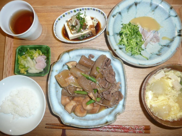 すき焼き風煮物、冷奴、小鯛の笹漬けきゅうり添え、冬瓜のスープ すき焼き風煮物には今日買ってきたお土産の麩が沢山入っていました。こんにゃくと玉葱と牛肉と麩でした。小鯛の笹漬けは珍しかったです。お酢が効いてさっぱりして美味しかったです。スープにはえりんぎと玉子が入っていました。