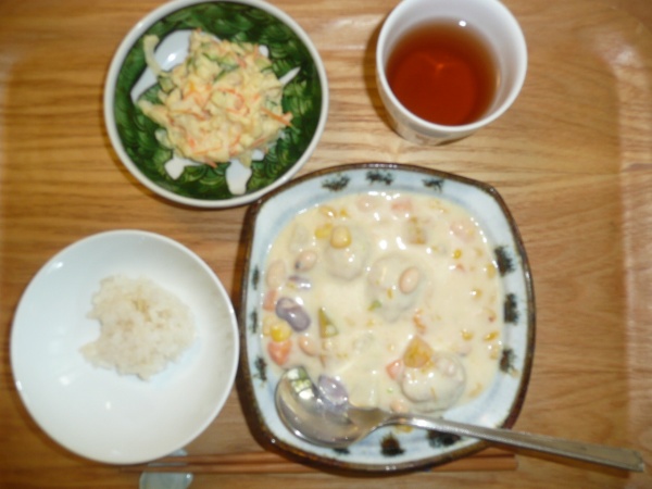 豆乳シチュー、ポテトサラダ、生姜ご飯 シチューには沢山の肉団子とコーンと豆と人参とかぼちゃが入っていて非常にヘルシーでした。生姜ご飯も暑いときには良いですね。デザートにロシアのケーキを頂きました。まるでゲッペイのような感じでした。甘かったです。