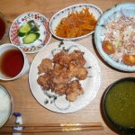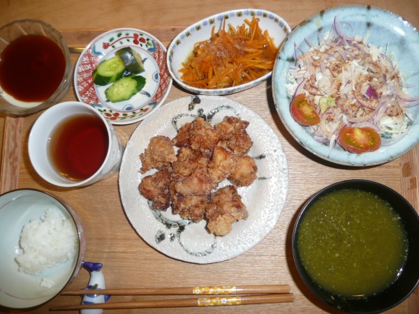 鶏の唐揚げ、人参のきんぴら、キャベツと紫玉葱とトマトのサラダ、モロヘイヤのスープ、きゅうりとなすの漬物 豆乳プリン 唐揚げはカラット揚がっていてとても美味しかったです。人参のきんぴらも珍しかったです。また、モロヘイヤのスープは初めて頂きました。少しとろみがありいかにも健康に良さそうです。今日も猛暑でした。暑くてお水を沢山飲んでしまします。冷房なしで頑張っています。冷房あまり好きでないので。しょうがありませんね。