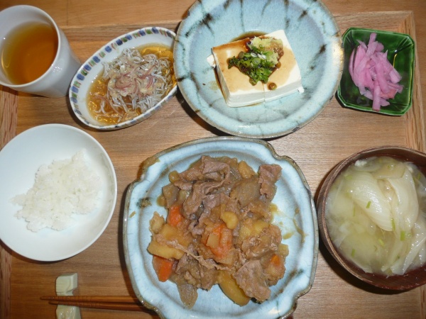 肉じゃが、しらすと大根おろしと茗荷、冷奴、玉葱スープ、赤カブ 今年一番の暑さの日には冷奴がとても美味しいです。しらすも茗荷が効いていて複雑なとても美味しい味でした。玉葱スープは玉葱ひとつが入っている丸まま甘いスープです。贅沢ですね。太ると思いながらお土産の東京バナナを食べてしまいました。