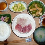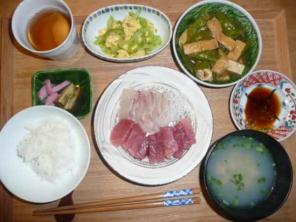 お刺身マグロと鯛、きゅうりと玉子の酢の物、まんがんじと揚げと煮物、蛤のお吸い物、お漬物 今日は嬉しいお刺身でした。岡山風にお茶漬けにして頂きました。まんがんじは初めて食べました。味はピーマンのようでうがとてもやわらかで美味しかったです。ししとうの大きなものの感じです。蛤のお吸い物もお汁が美味しいですね。