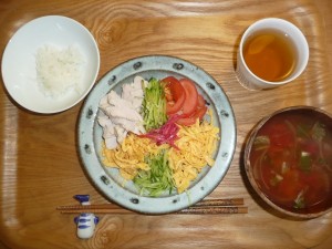 冷麺、とまとスープ、白菜のお漬物 冷麺にはとりハムと玉子焼きときゅうりととまとが沢山のっていました。冷麺だけでは物足りずご飯も頂きました。スープには白菜や玉葱やエリンギが入っていました。