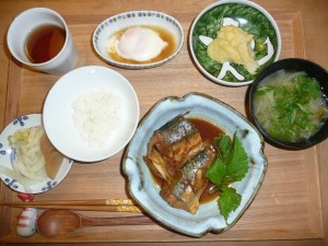 さばの味噌煮、温泉玉子、里芋のあんかけ、玉葱とキャベツのスープ、お漬物二種 スープは本当に沢山のキャベツと玉葱が入っていてとてもヘルシーで美味しかったです。久し振りのさばも美味しく頂きました。お昼はお好みでしたから夜はあっさろと和食でいいですね。