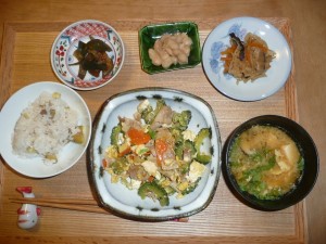 ゴーやチャンプル、切り干し大根、白福豆、豆腐としいたけと大根と春菊と玉子のお味噌汁、栗ご飯、お漬物 夏の最後にゴーヤが食べれて凄く嬉しいです。今年は一回くらいしかチャンプルがなかったので。この気候でゴーヤもあまり出来ないみたいです。栗ご飯は嬉しかったです。秋を感じました。