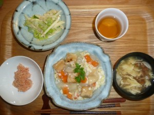 高野豆腐のグラタン、りんごとレタスの胡麻ドレサラダ、玉子となめこのスープ、とまとライス 今日はひんやりしているので何故かスープがとても美味しかったです。グラタンも中心が高野豆腐であっさりしていました。今日も腹八分目でお腹すっきりです。