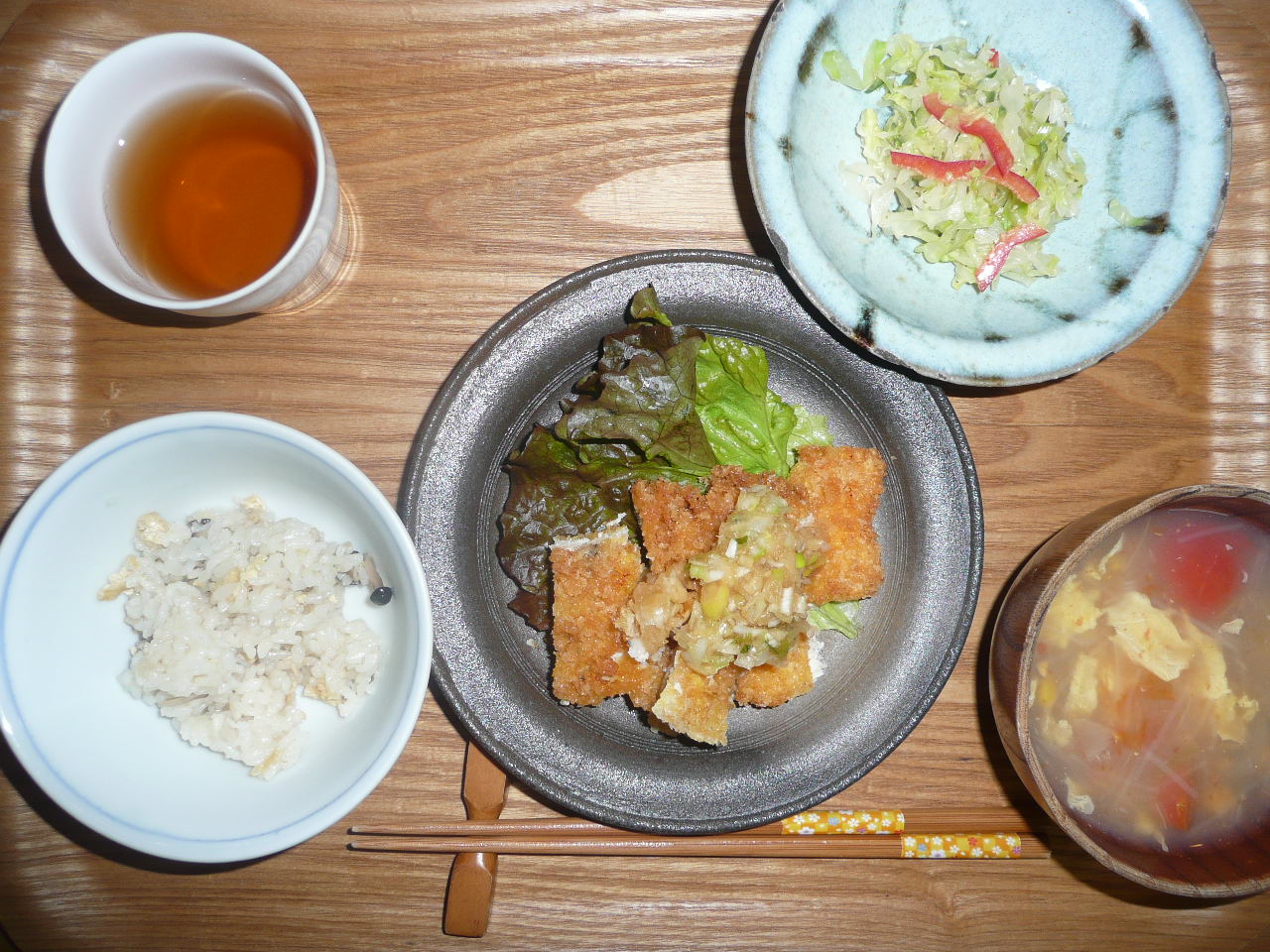 鶏ムネ肉のフライ薬味がけレタス添え、キャベツときゅうりとパプリカのサラダ、コーンスープ、きのこご飯 今日のフライは本当にパリッと揚がっていて美味しかったです。おかわりしちゃいました。それに大好きなコーンスープも春雨入りで作ってくれました。サラダも色合い良くて美味しかったです。今日は一日雨模様で寒いです。
