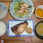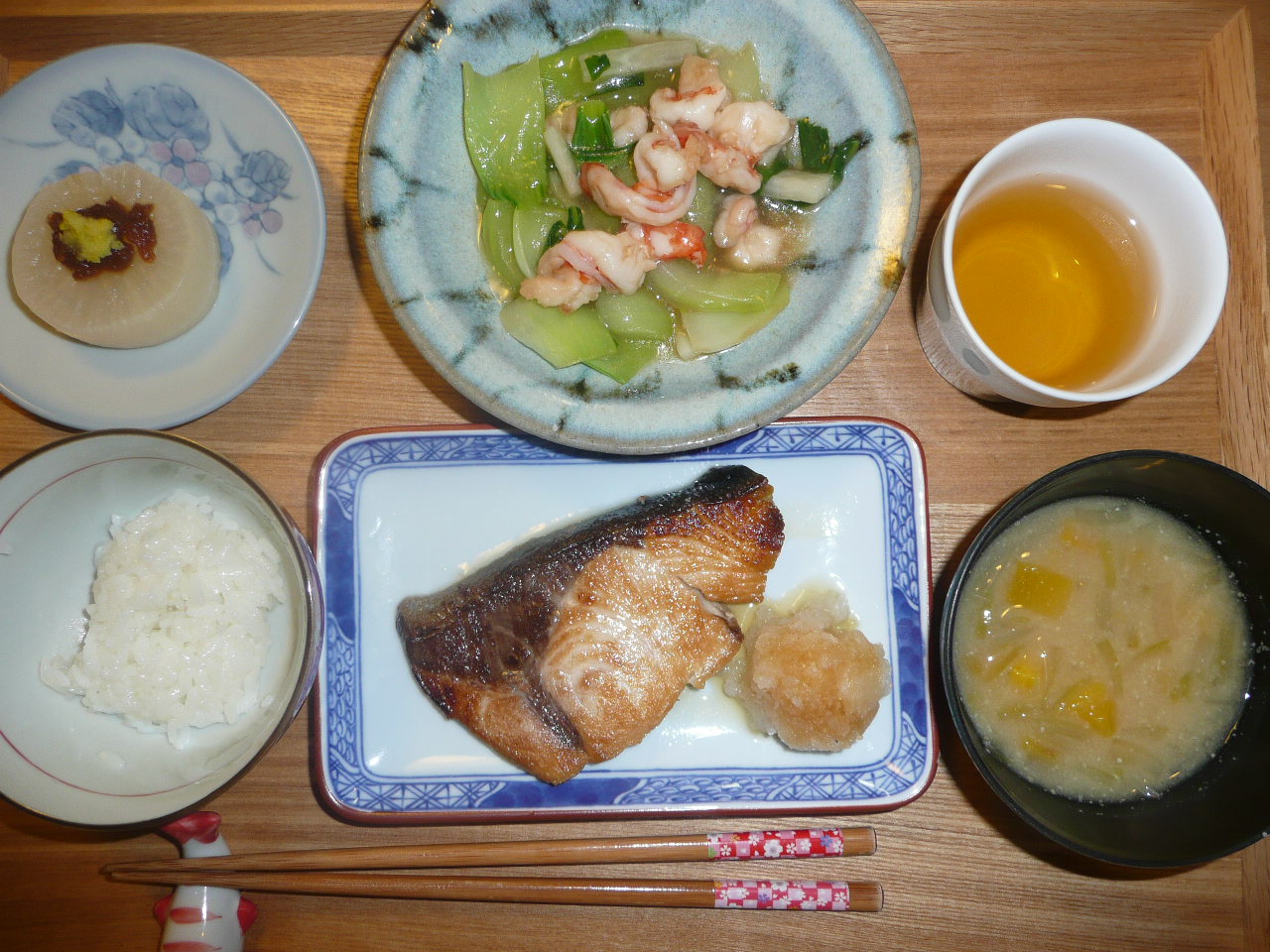 ぶりの塩焼き大根おろし添え、ふろふき大根、青梗菜と長いもと海老の中国風あっさり炒め、玉葱とナンキンのお味噌汁 今日はシェフに照り焼きがいいか塩焼きがいいか聞かれたのでしばらく食べていなかった塩焼きを頼みました。とても美味しかったです。青梗菜がやわらかで美味しい。それと中華風のあっさり炒めこれも美味でした。和風に中華に充実した夕食でした。