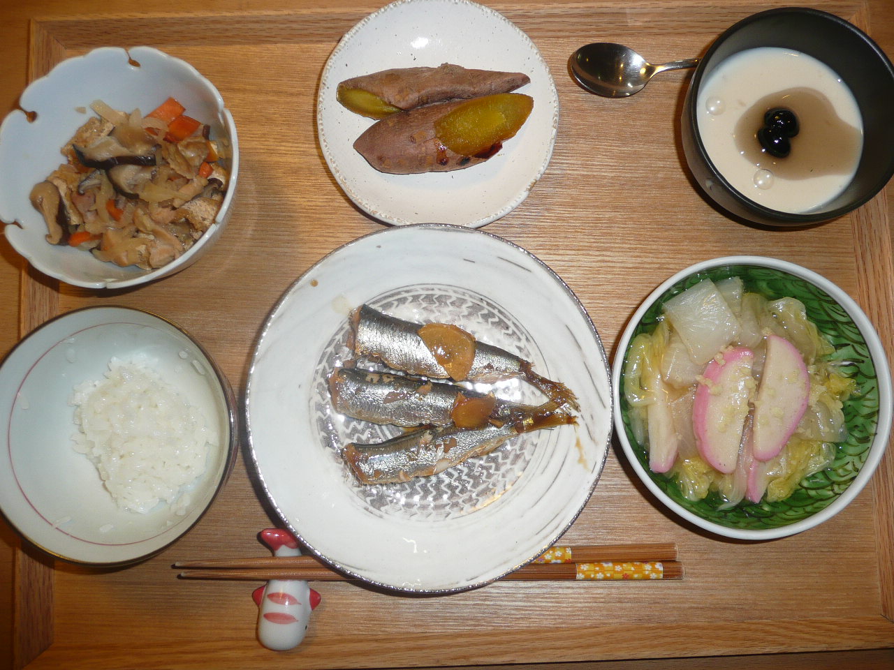 鰯の梅煮、白菜とかまぼこと生姜の煮物、切り干し大根、豆乳プリン、安納芋 白菜とかまぼこに生姜は凄く美味しかったです。煮物に生姜をのっせるだけで味が一変しますね。初めての味でした。鰯もいいお味でした。ここでも生姜が使われていました。さつまいもは金時色をしたやわらかいお芋です。凄く美味しかったです。