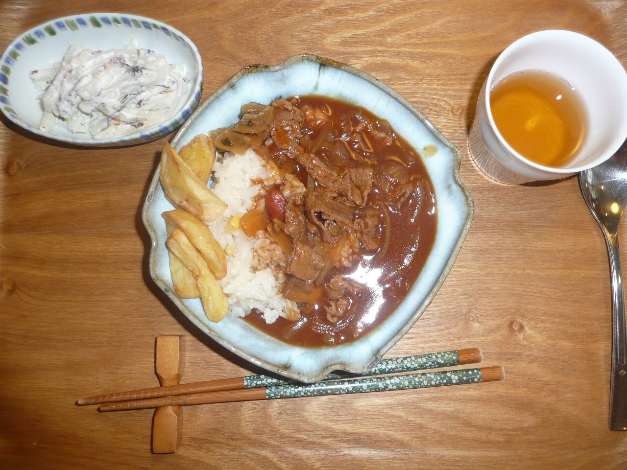 ハヤシライス、山芋の梅サラダ、ポテトフライ、漬物 ハヤシライスはコーンライスでした。やはりおかわりしてしまいました。山芋と梅は良くあっていてとても美味しかったです。ラオス帰りのシェフにお土産のラオコーヒーなるものを頂きました。ラオスのコーヒーです。濃いらしいです。干した果物もい頂きました。マンゴーやいちごや檸檬やオレンジです。美味でした。