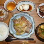 鶏手羽先と白菜と長ネギの煮物、温泉玉子、蓮根饅頭、なめこと胡麻豆腐のお澄まし、金山時味噌、漬物 久し振りのシェフの夕食は私の大好きな鶏手羽先でした。私はチューチューすって食べるのが好きです。明日はきっとお肌つるつるです。金山時味噌は熱々のご飯と頂くと最高です。デザートにみたらし団子もありました。それにみかんも頂きました。