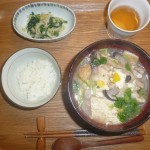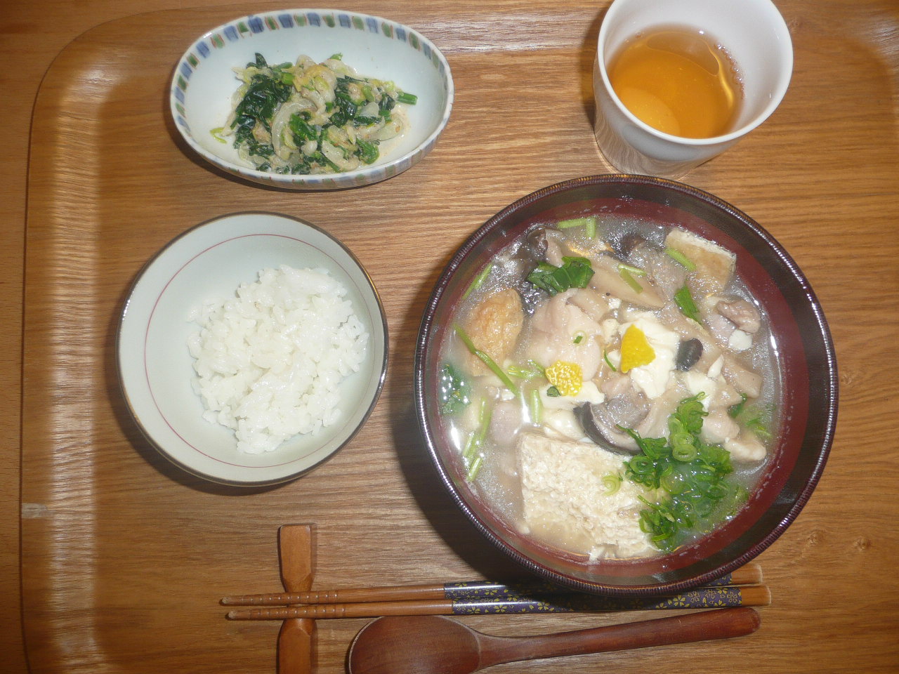 鶏肉のみぞれ鍋、ほうれん草と白菜の胡麻和え、漬物二種 お鍋には鶏肉の他、豆腐と揚げと椎茸と平たけ、しめじと大根のすりおろしが入っていて体がとても温まりました。シェフのおかわりいかがの甘い誘惑に負けてまたおかわりしてしまいました。この頃毎日おかわりしています。体重も増えています。食欲の冬止まりません。