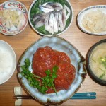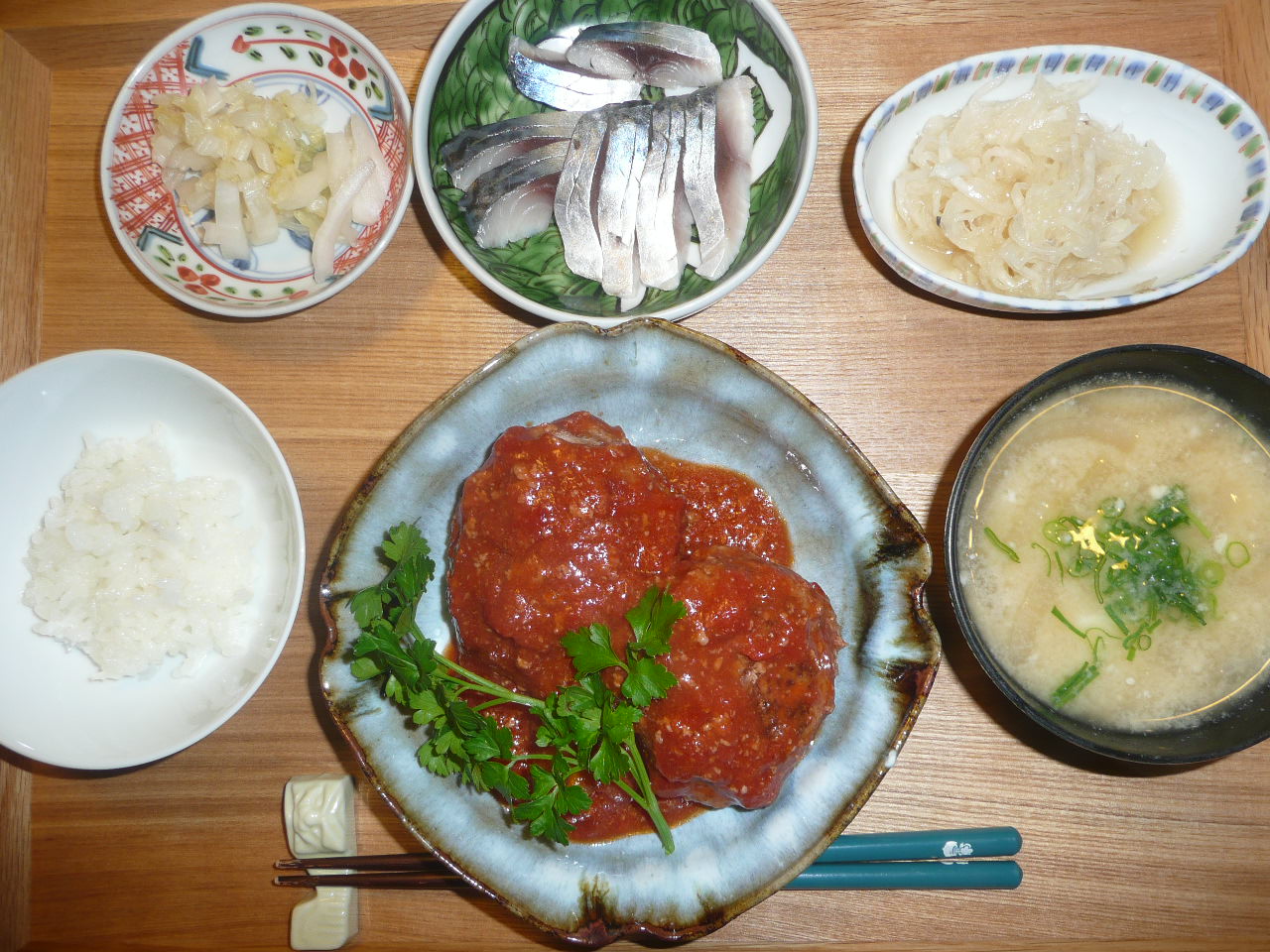 豆乳入りハンバーグ、大根サラダピエトロドレッシングがけ、き寿司、胡麻豆腐と玉葱とじゃがいものお味噌汁、白菜の漬物 トマトソースのハンバーグは普通サイズ2個美味しく頂きました。結構お腹が一杯になりました。大根さらだはドレッシングがとても美味しかったです。き寿司も好きです。わさびで頂いたらよかったかな。忘れていました。