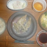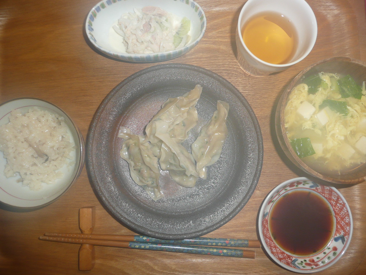 焼き餃子蒸し餃子、大根つなサラダアボガド入り、玉子と豆腐スープ玉葱青梗菜入り、きのこご飯 今日は餃子包みのお手伝いをしました。大好きな餃子は13個も頂きました。今日は蒸しが美味しかったかな。サラダもスープも良いお味でした。きのこご飯もいいですね。