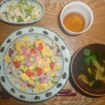 ちらし寿司、豆腐とレタスの胡麻ドレサラダ、きのことワカメのお吸い物 ちらしにはサーモンが入っていて玉子と赤カブでかわいくトッピングされていました。胡麻ドレサラダはヘルシーで美味しかったです。お吸い物もいいお味でした。