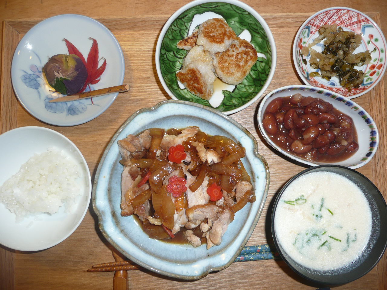 鶏もも肉の照り焼き玉葱人参添え、蓮根饅頭、金時豆、揚げ入り豆乳汁、すぐきの漬物、茶巾絞り 照り焼きは良く味がしみていて玉葱とともに食べると凄く美味しかったです。豆乳汁にはお揚げさんが良く合います。デザートに茶巾絞りは四色のお饅頭でとても色鮮やかでした。美味しかったです。