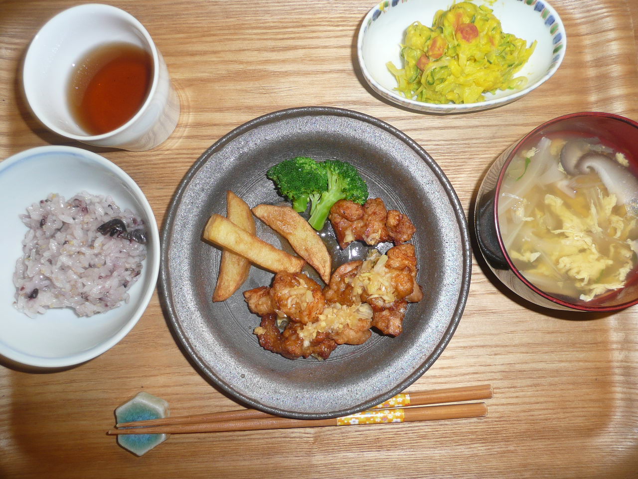 クリスマスの鶏の唐揚げ薬味がけポテトフライとブロッコリー添え、かぼちゃのサラダ、椎茸と白菜と玉子のスープ、五穀米ご飯 今日までクリスマスメニューでした。かぼちゃサラダの人参が西洋人参と赤い人参が入っていてとても彩りが綺麗でした。クリスマスの演出ですね。唐揚げもカラッとしていてとても美味しかったです。今日n余興で影絵をしていました。