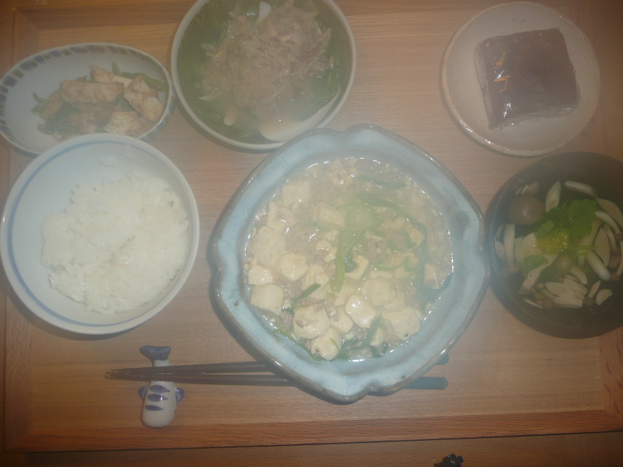 麻婆豆腐、三度豆と豆腐揚げの胡麻和え、大根とさば缶の酢の物、きのこのお吸い物、チョコレートケーキ、私は夕食にいくらの醤油漬けを持ってきて白ご飯にたっぷりかけて頂きました。もう最高の贅沢ですがとても美味しかったです。一年に一回こんな贅沢がしたくなります。今日までクリスマスなのでおやつのチョコレートケーキを頂きました。美味でした。