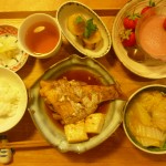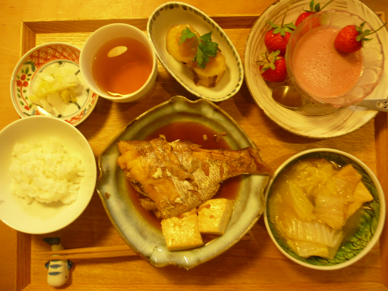 鯛の煮付け豆腐添え、さつまいもの煮物、揚げと白菜の煮物、白菜の漬物、イチゴとイチゴのゼリー 凄く美味しい鯛でした。見もぷりぷりしていました。デザートのイチゴゼリーは今の季節にぴったりですね。