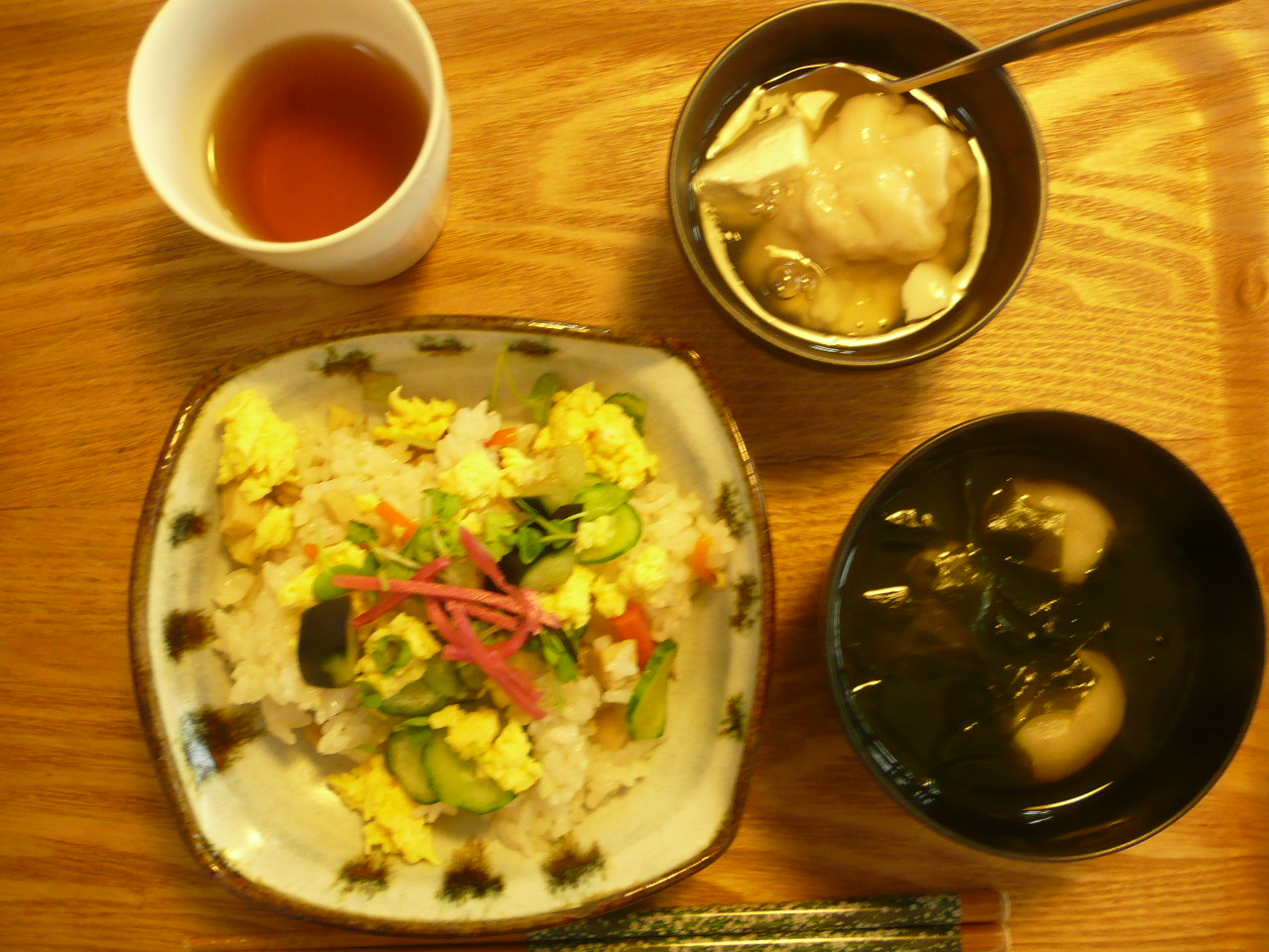ちらし寿司、おぼろ豆腐と胡麻豆腐のあんかけ、わかめと麩のお吸い物 お寿司には高野豆腐ときゅうりとなすと玉子焼きが入っていてあっさりして美味しかったです。今日特に懐かしかったのは麩の入ったお吸い物でした。小さい時はよく母がお味噌汁に豆腐とわかめと一緒に麩をいれてくれました。それを思い出しました。お食事の後はデイで手文字アートが繰り広げられました。皆さん毛筆で丸を書いてらっしゃいました。少々哲学的でした。