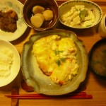 グラタン、里芋の煮物、山芋ときゅうりのマヨ紫蘇和え、エリンギのお味噌汁、白玉団子のあんこがけ チーズたっぷりのグラタンが凄く美味しかったです。時に洋食も良いですね。マヨ紫蘇和えも凄くさっぱりして美味でした。デザートも嬉しいですね。和菓子でした。