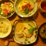 鶏ハムとべったら漬け、ゆりねとちくわの玉子とじ、白菜と赤カブの酢の物、蜆のお味噌汁、銀杏の炊き込みご飯 ゆりね少し苦味があっていいですよね。玉子と良くあいます。蜆のお味噌汁はだしがよく出ていて美味しかったです。銀杏ご飯も旬ですね。