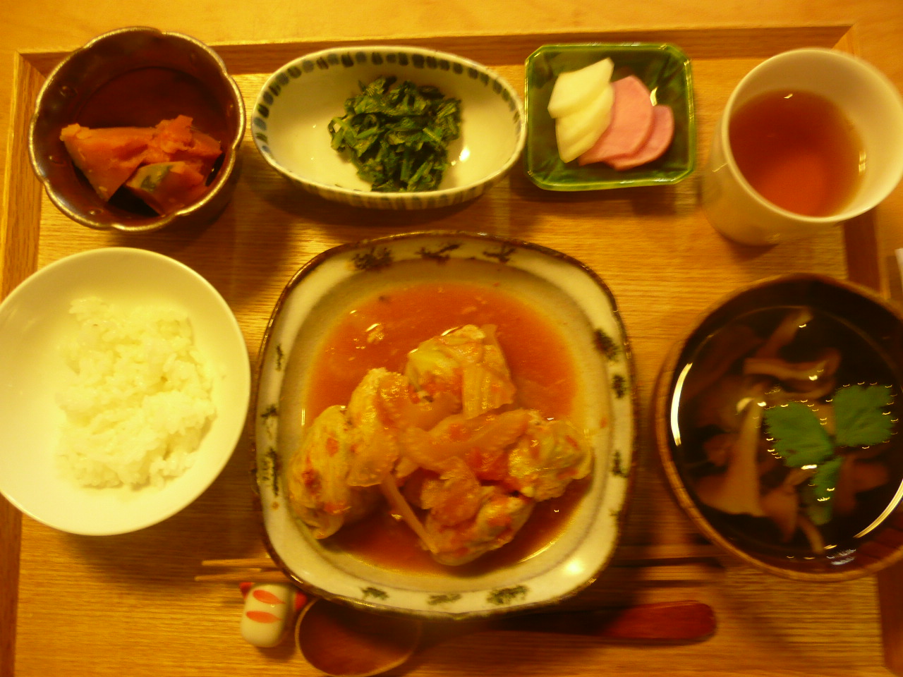 ロールキャベツ、ナンキンの煮物、ほうれん草のおしたし、きのこのお吸い物 本当に一年振りくらいです。ロールキャベツは。セロリーのせでした。セロリーが入るの少しアジアな味になりますね。でも美味しかったです。ケチャップ味でした。