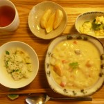 お野菜たっぷりの豆乳シチュー、きゅうりのサラダタルタルソースがけ、フライドポテト、なめしご飯 野菜は主に玉葱でにんじんやかぼちゃも日入っていました。なめしご飯は水菜とつなと生姜のご飯です。美味しかったです。