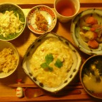 ホタテのグラタン、炊き合わせ、金山時味噌、大根とツナのマヨ和え、わかめと玉子のお味噌汁 炊き合わせはなんきんと里芋とこんにゃくとゴボ天でした。
