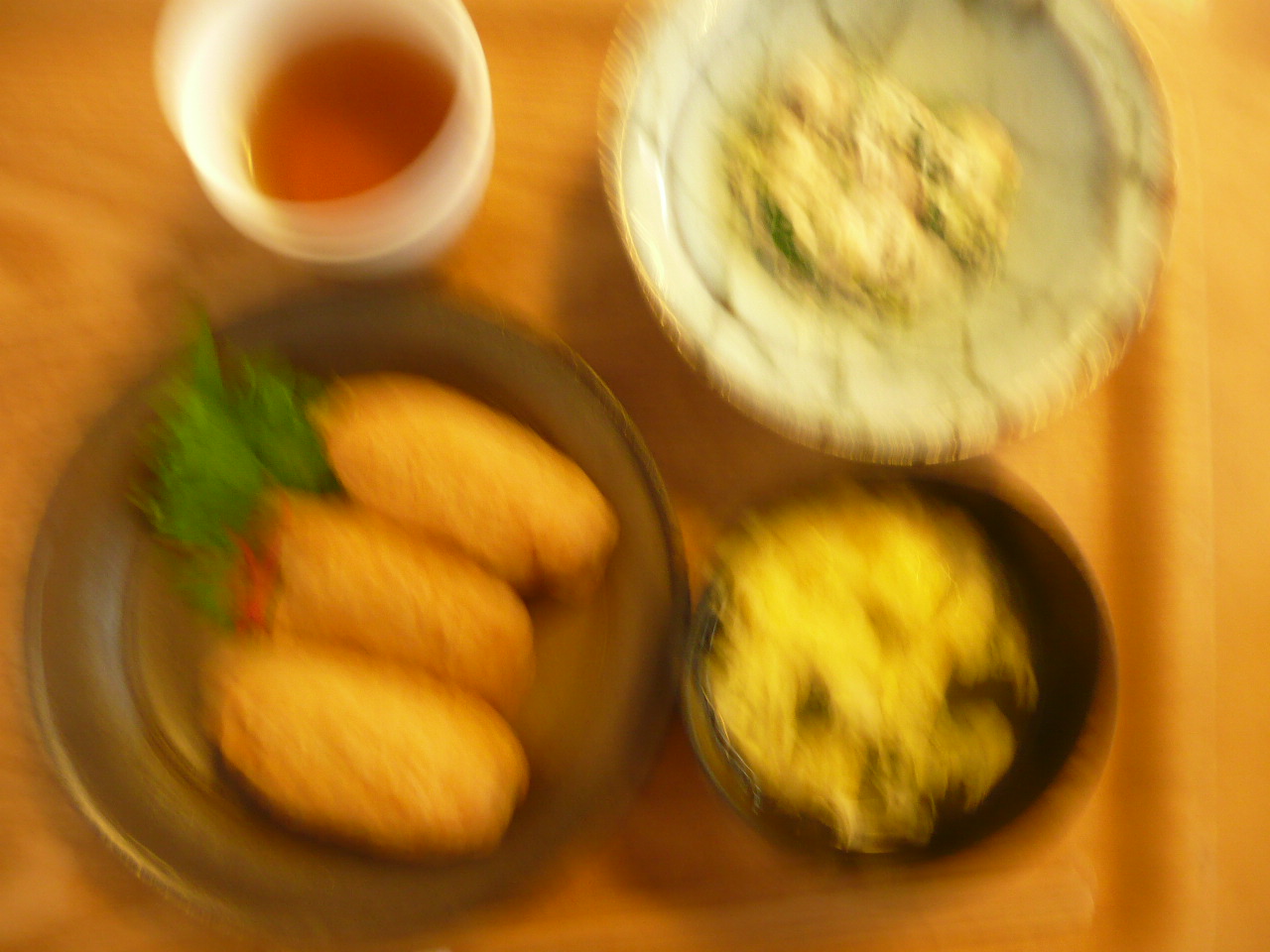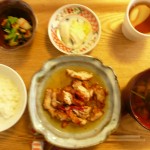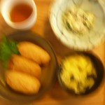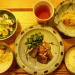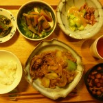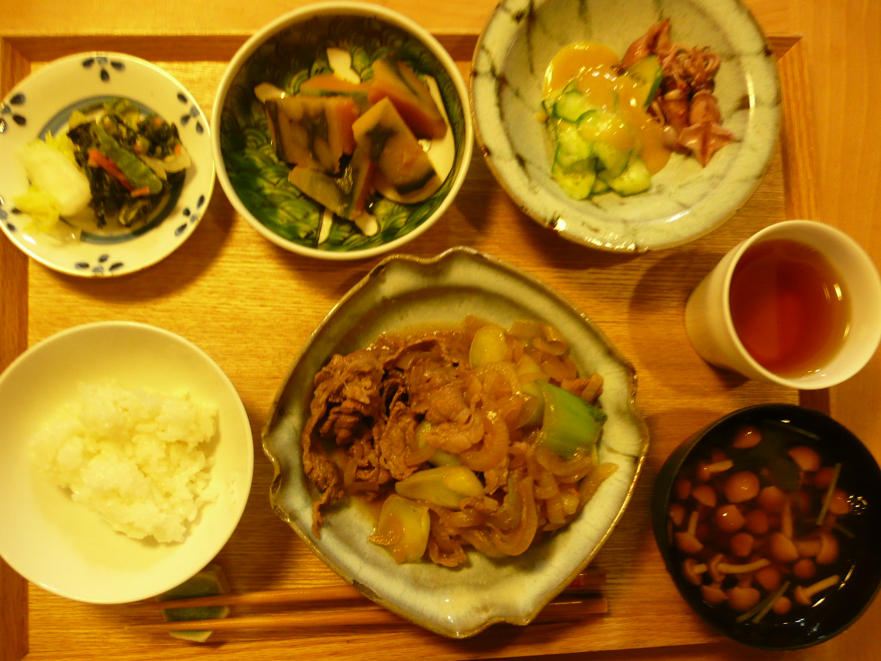 牛肉と玉葱と青梗菜の炒め物、なんきんの煮物、ほたるいかの酢味噌和えきゅうり添え、なめこのお吸い物、漬物二種 ほたるいかの美味しいことってないですね。大好きな旬の味です。牛肉を少しとりましたがお野菜たっぷりがいいですね。