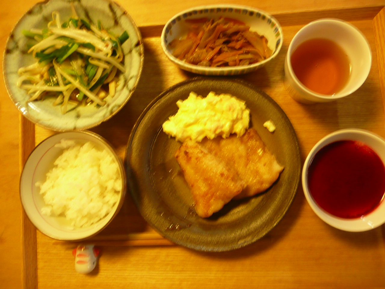 甘鯛のムニエルタスタスソースがけ、もやしとにらの炒め物、ごぼうと人参のきんぴら、牛乳寒天 ムニエルも炒め物もきんぴらどれもとても美味しかったです。今日の私の体調に合っていたのでしょうか。