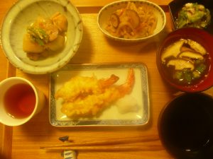エビフライ、きゅうりといかの酢の物、えび芋と鶏肉の煮物、切り干し大根、昆布とおくらとしいたけのお吸い物