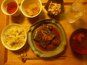 秋刀魚の梅煮、大根の煮物、蒸し鶏とラディシュの和え物、豆腐とわかめの赤だし、マツタケご飯
