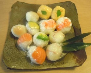 アボカド、卵、海老、サーモン、ホタテ貝柱、鯛の昆布〆を手まり寿司にしました。
