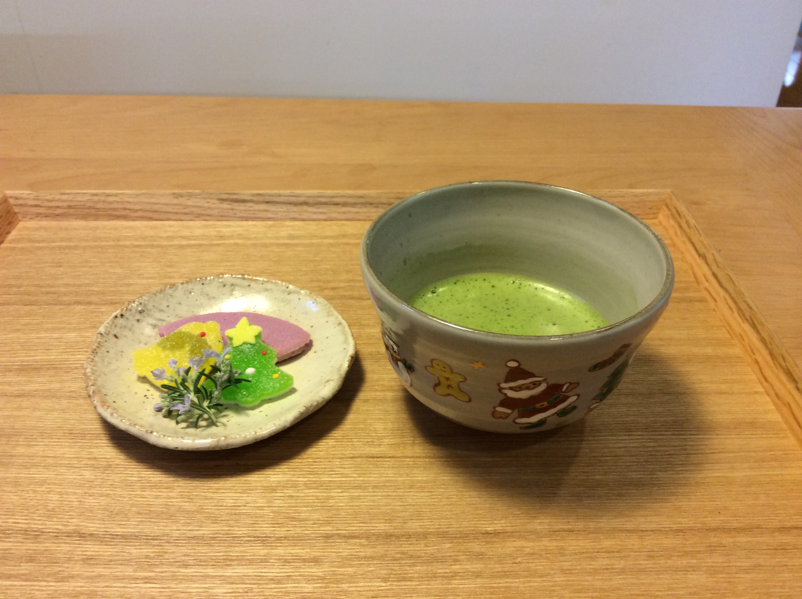 今回のお菓子は、紫芋ひとひらサブレと河藤(四天王寺参道)さんのクリスマスゼリーです。