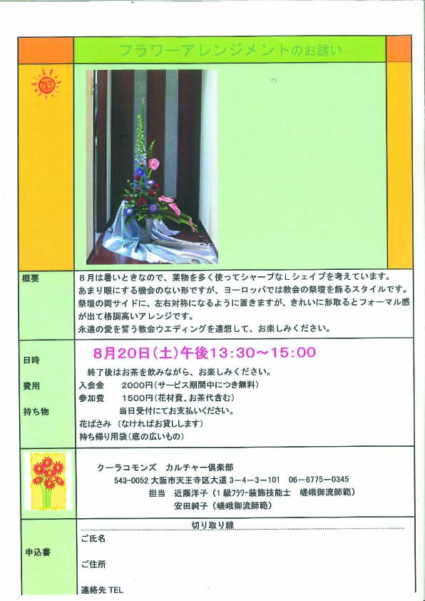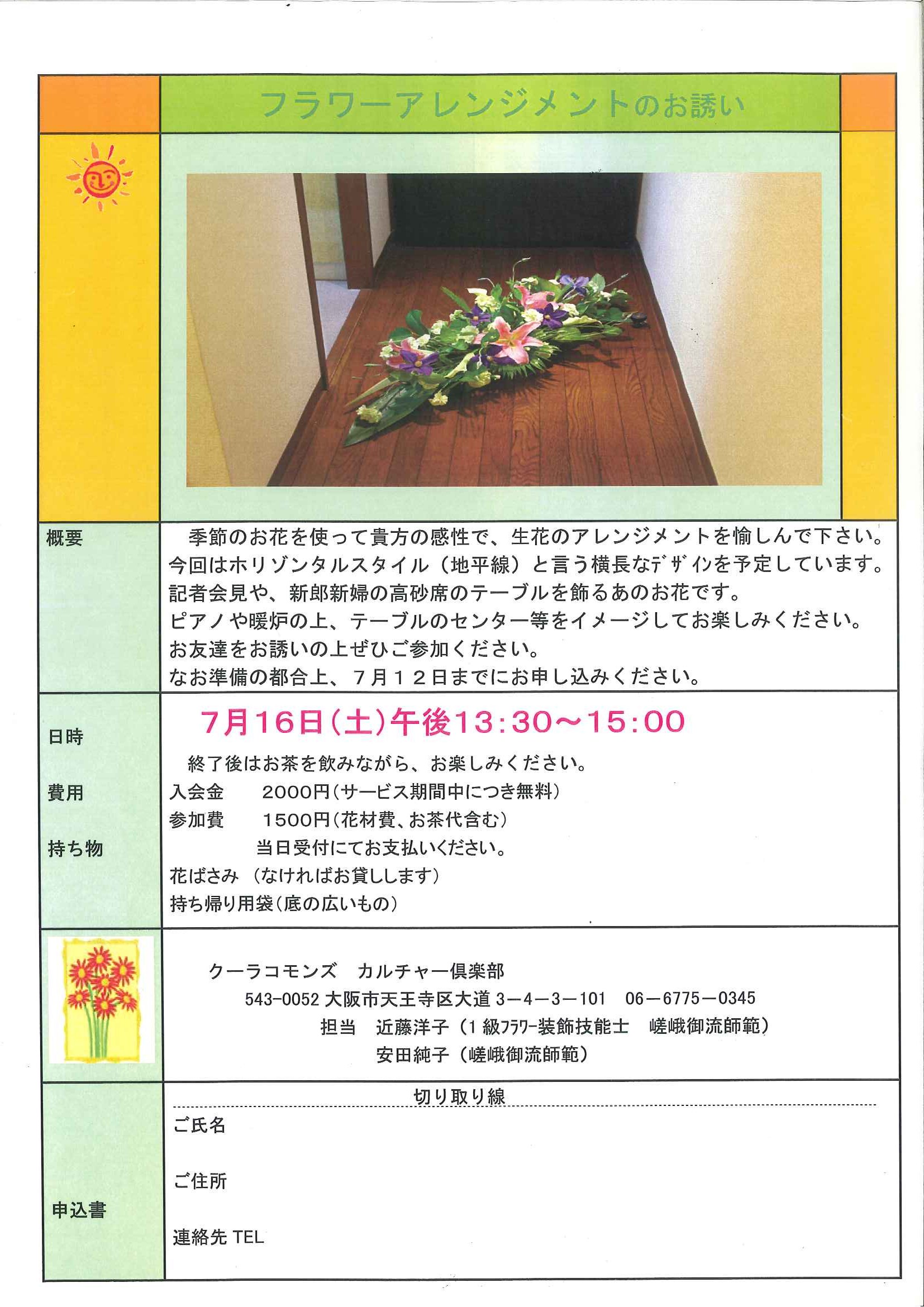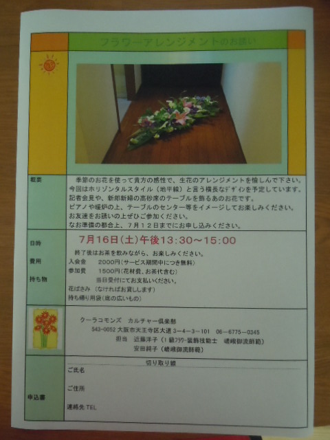 7月アレンジメント 2011年6月24日2011年6月28日 - moritoshi Leave a comment 7月16日に、7月のフラワーアレンジメント講座を開催します。 お気軽にご参加ください。