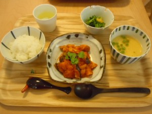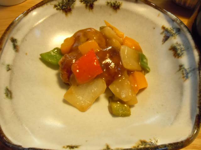ある日、利用者さまのお一人が「酢豚を食べたいね」とおっしゃったので作りました。でも、やはり、お肉がかたければ、せっかくのご馳走も喜びも台無しになりますので、豚ミンチでしゅうまいのタネを作り、片栗粉をまぶして揚げました。お野菜はカラーピーマンを使い、派手目な色合いに仕上げました。