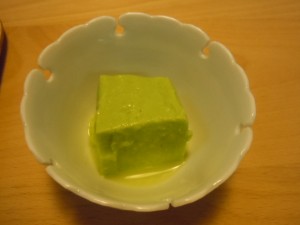 朝焼け豆腐(出来上がりの色がとっても鮮やかできれいだったので命名しましたが、正体はカラーピーマンの皮をしっかり焼き、こげた皮を洗って取り除いたもの、豆腐、チキンスープをしっかりミキサーして寒天で固めます) 今、施設で元気に新芽をだしている楓の葉を添えました